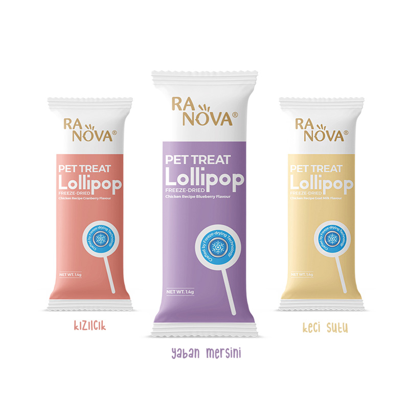 Renkli lolipop şeklinde tasarlanmış Ranova köpek ödülü, kedilerin ilgisini çekerek eğlenceli bir şekilde beslenmesini sağlar. İçeriğinde kullanılan aromalar kedilerin damak zevkine hitap eder.