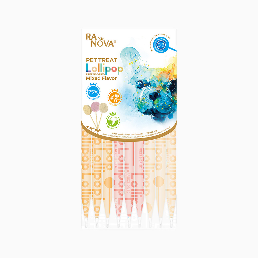 Renkli lolipop şeklinde tasarlanmış Ranova köpek ödülü, kedilerin ilgisini çekerek eğlenceli bir şekilde beslenmesini sağlar. İçeriğinde kullanılan aromalar kedilerin damak zevkine hitap eder.